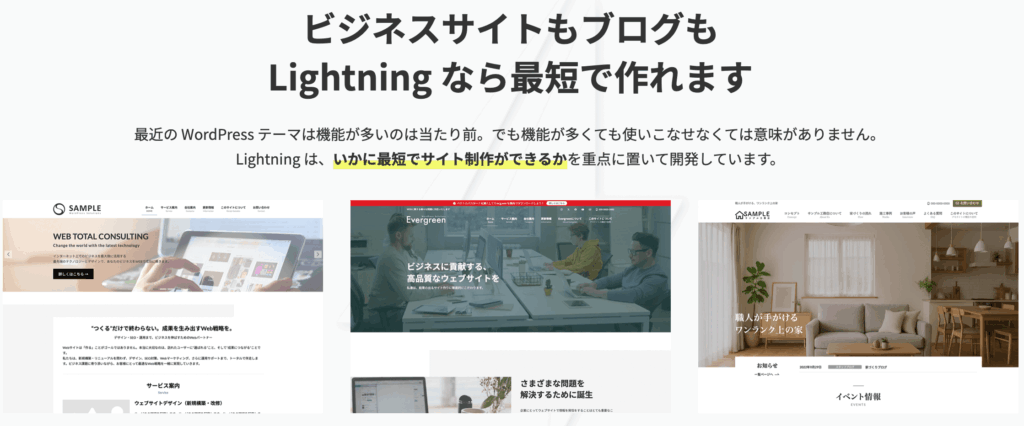 Lightningは、個人ブログはもちろん、企業のコーポレートサイトや店舗サイトまで、幅広く対応できる万能テーマです。