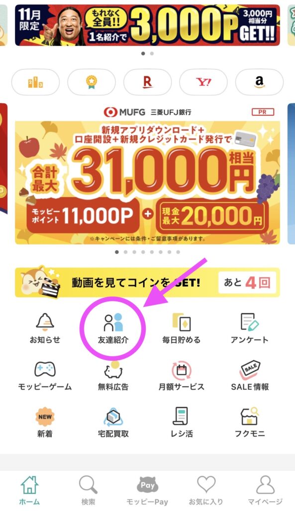 - モッピーアプリを開き、画面の中央あたりに「友達紹介」という項目があるので、そこをタップします。