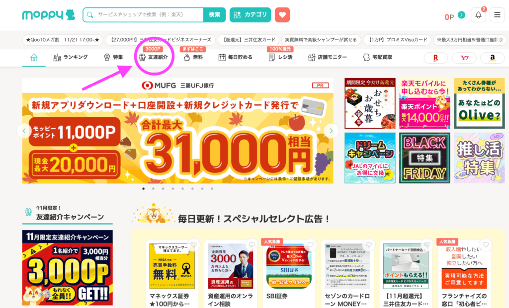 モッピーでは、期間限定で友達紹介キャンペーンが開催されることがあります。「紹介ボーナスが500Pにアップ」「お友達の特典が3,000Pに!」など、通常よりもさらにお得になる期間があります。